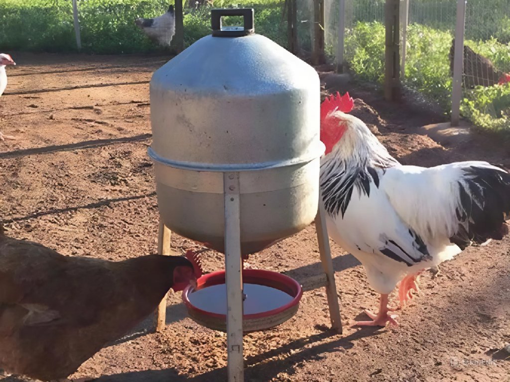 Barelová napáječka pro drůbež s miskou a 30L zásobníkem do 90 slepic krmítko ØxV 450x710 mm miska V 170 mm