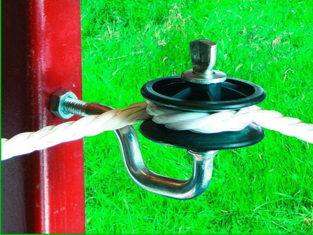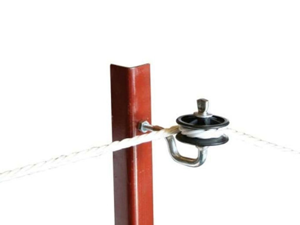 Rohový izolátor, pro elektrický ohradník, pro drát, lanko nebo pásku, plně otočný válec, skvělé izolační vlastnosti, vysoce odolný, se závitem M6.