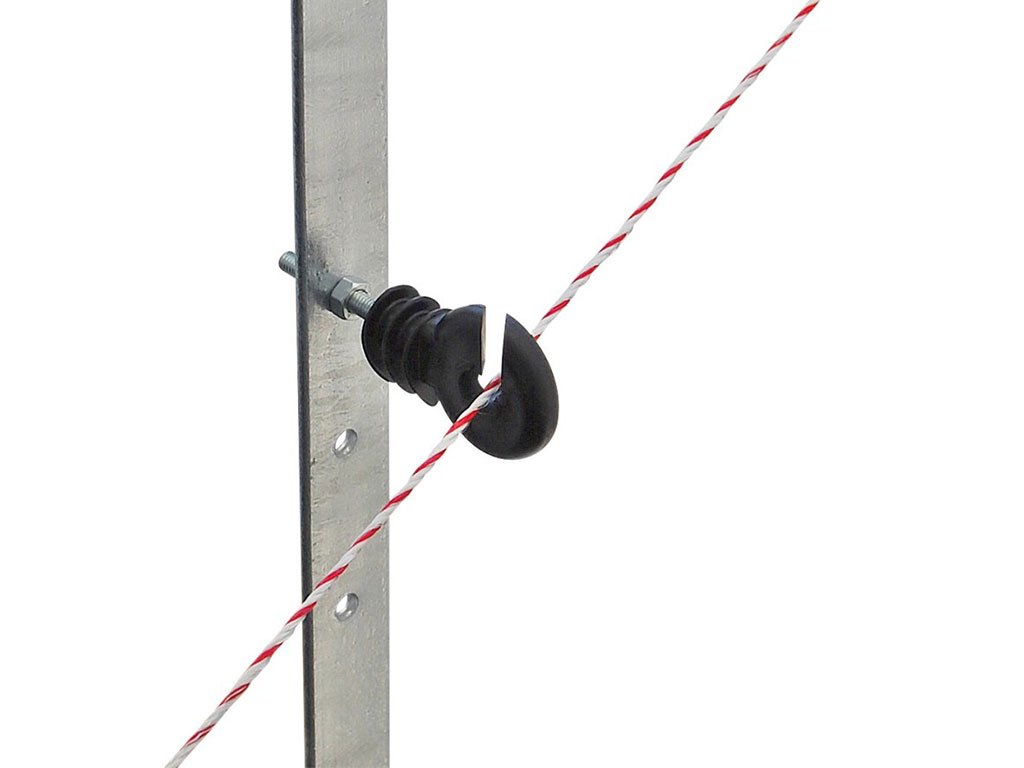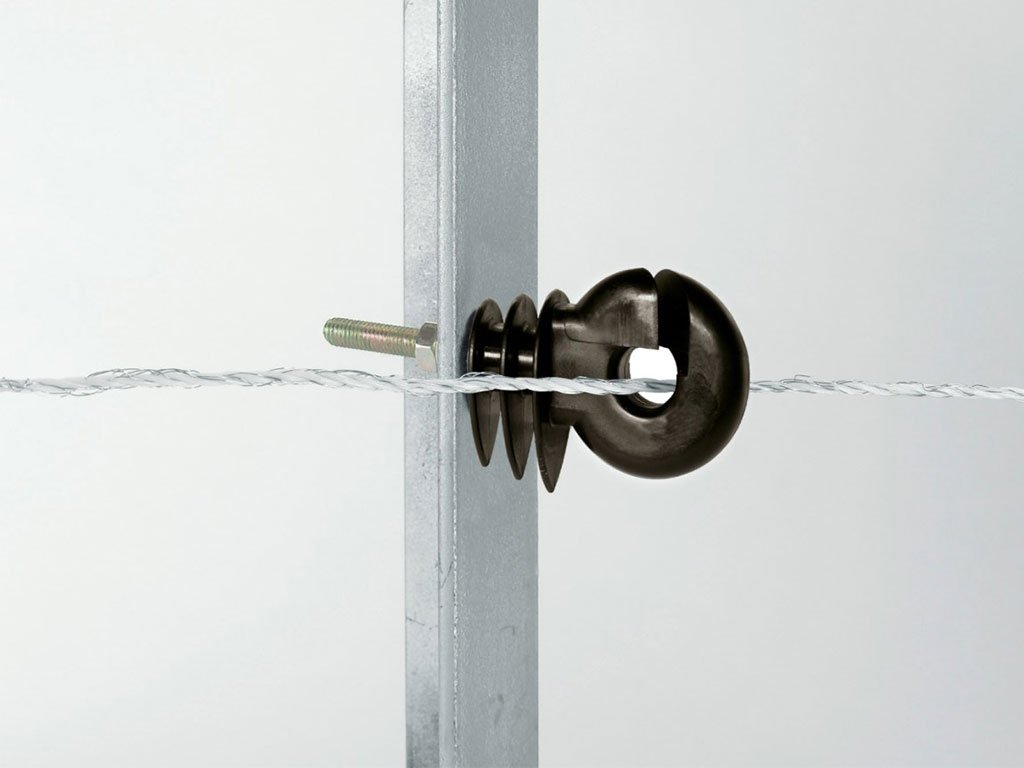 Kruhový izolátor, pro elektrický ohradník, pro drát, lanko nebo pásku, 2 matice, s metrickým závitem, délka vrutu 35 mm, průměr 6 mm.