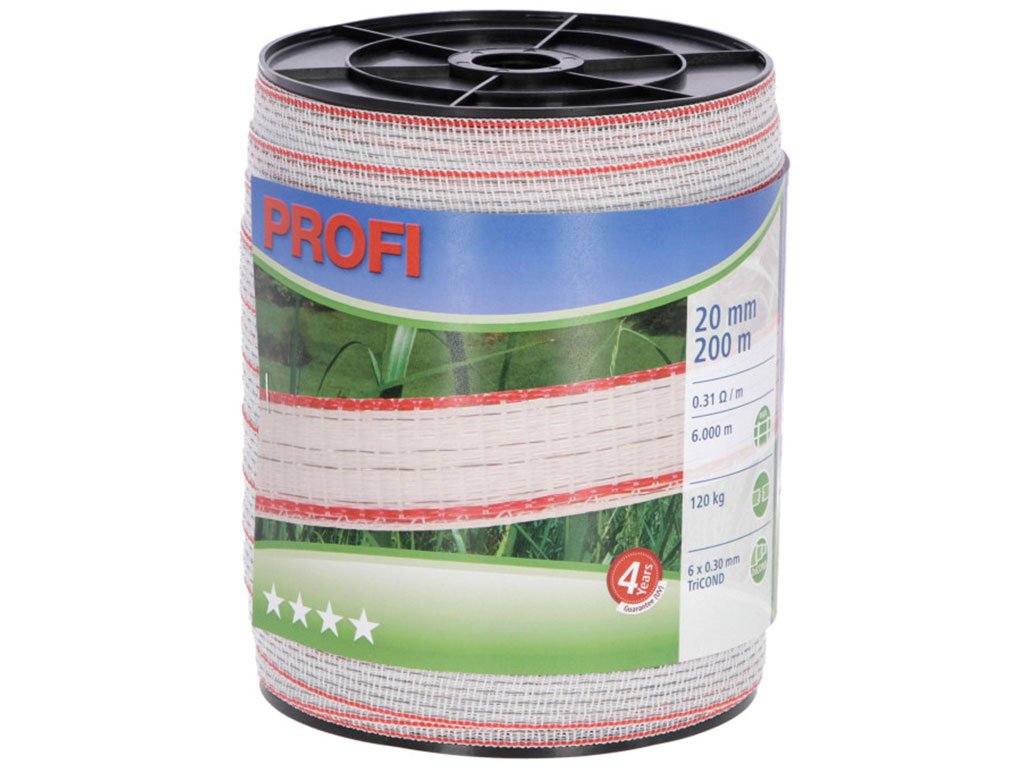 Ohradníková páska, pro elektrický ohradník, 6 vodičů 0,30 mm TriC, vysoká vodivost, dobrá viditelnost, šířka pásky 20 mm, délka 200 m.