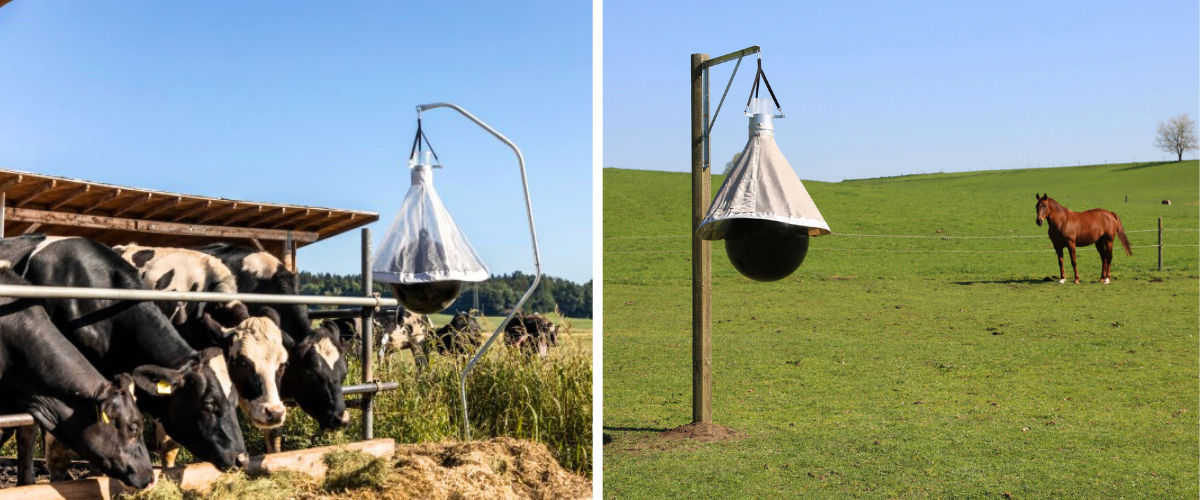Závěsný lapač ovádů, pro plochy do 5000 m², do ohrad, stájí, zahrad, výběhů, kempů, hřišť, parků a na stromy, šetrné k životnímu prostředí, průměr cca 1,10 m, hmotnost cca 8 kg.