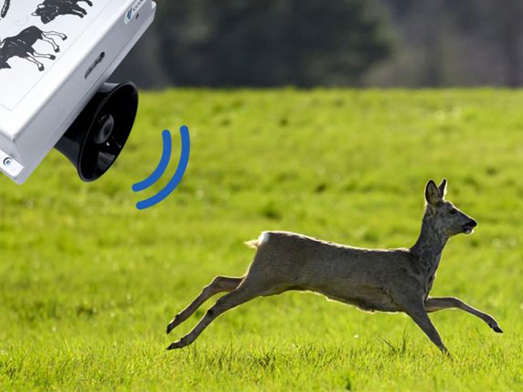 Zvukový odpuzovač divoké zvěře, napájení 230 V nebo 12 V baterie, chrání plochu až 7000 m2, reprodukuje velmi hlasité zvuky, vestavěný výkonový zesilovač, radarový senzor pohybu, s ochranou IP44, soumrakový režim, dálkové ovládání zařízení, různé režimy provozu, rozměry 22,5x16 cm.